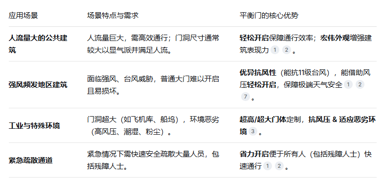 "超高平衡门"主要应用于那些门洞尺寸巨大,且对开启省力度、抗风压能力、气密性和耐用性有严苛要求的场所。它巧妙利用机械平衡原理或风压,让推动沉重的大型门扇变得轻松。